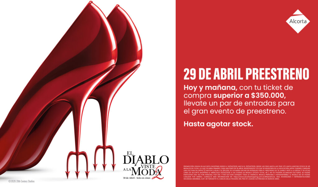 El Diablo Viste a La Moda 2 | Preestreno PROMOCIÓN VÁLIDA EN ALCORTA SHOPPING DESDE EL 24/04/2026 HASTA EL25/04/2026, DESDE LAS 10HS HASTA LAS 21HS Y/O HASTA AGOTAR STOCK DE 45REGALOS EN TOTAL, LO QUE OCURRA PRIMERO, PARA MAYORES DE 18 AÑOS,REGISTRADOS Y/O QUE SE REGISTREN EN LA APLICACIÓN ¡APPA! QUIENES CARGUENUNA FACTURA EN ¡APPA! […]